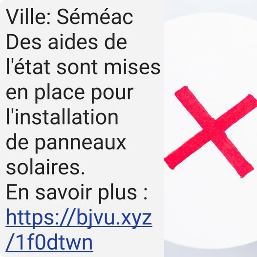 Les services de la mairie ont été alertés sur la propagation de SMS frauduleux, qui se réclamant de la mairie proposent l’installation de panneaux solaires cf ci-contre>>>