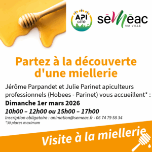 Julie et Jérôme vous feront découvrir le métier d’apiculteur, la vie fascinante des abeilles et les produits issus de la ruche (avec démonstration).