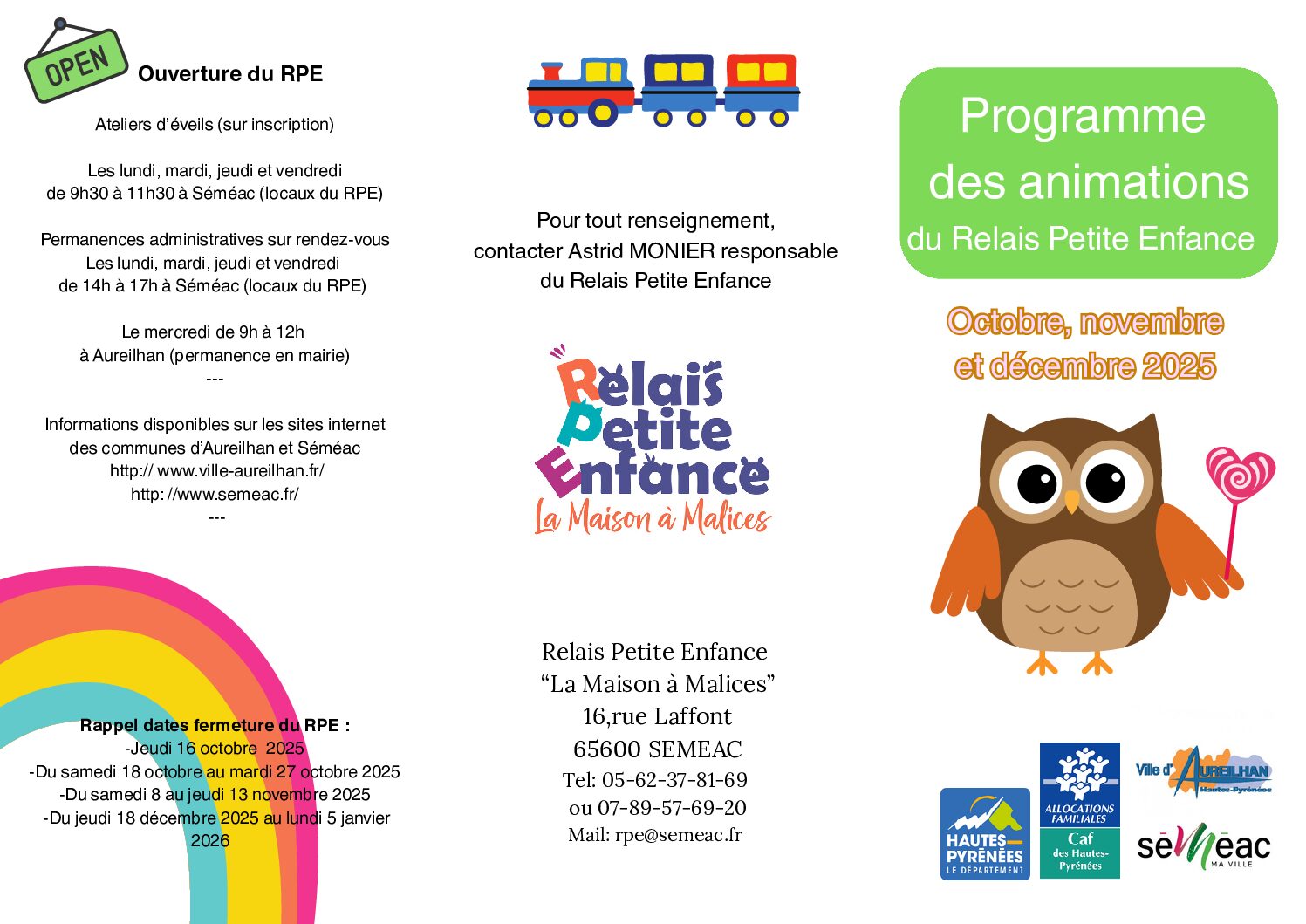 Le RPE est une « Maison à Malices » où se retrouvent les tout-petits et les assistant.e.s maternel.le.s de Séméac et d’Aureilhan. Un programme adapté dans un milieu douillet et spécialement équipé pour l’éveil « pré- école maternelle ».