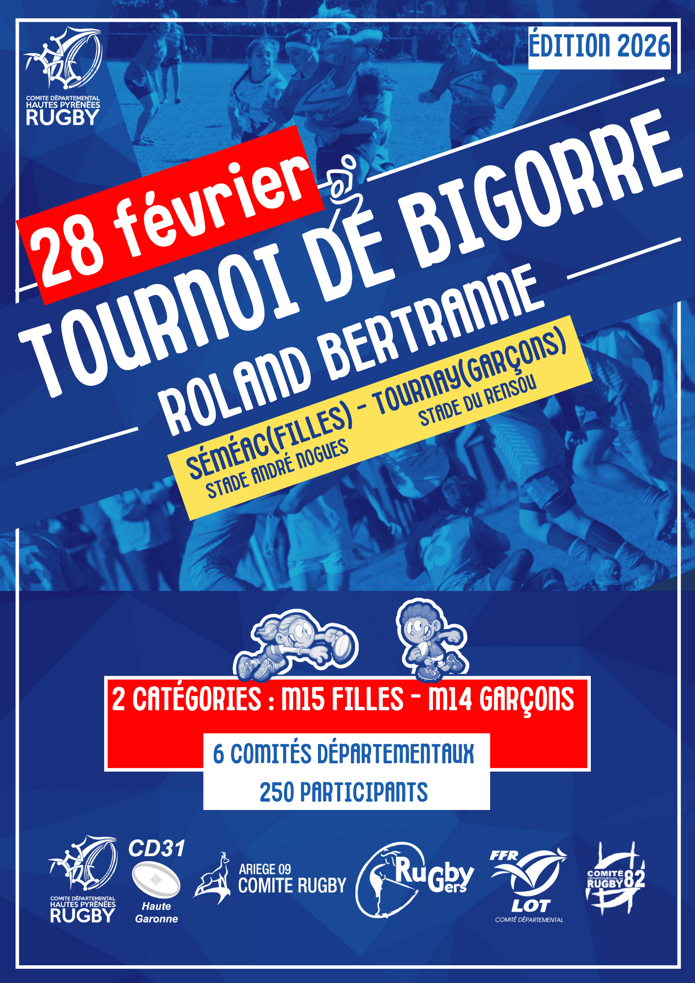 Tournoi de Bigorre de rugby, en catégories filles et garçons. Un après-midi de sports avec des animations sur le stade André Noguès: saut en parachute, Kdanses…